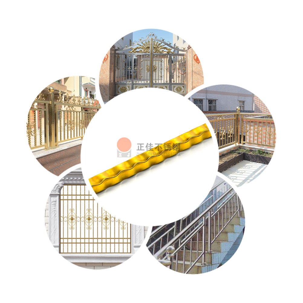本款產品是新型的藝術不銹鋼花紋管,不銹鋼管通過機壓工藝壓出波浪花紋然后表面作鈦金電鍍處理。廣泛應用于各種防盜網,大門,欄桿等。